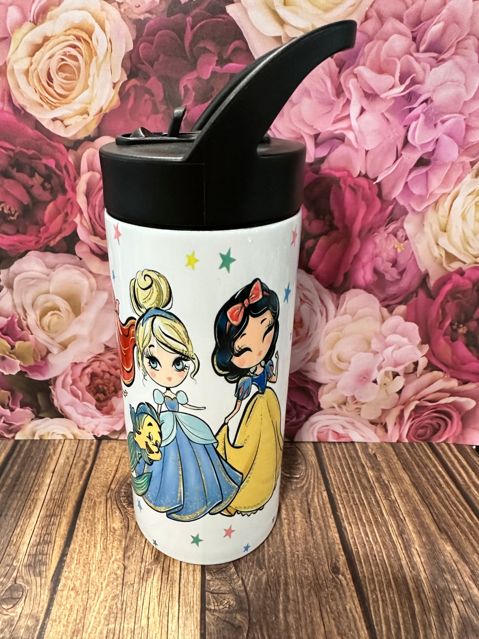 Princess themed sublimated image on a 16 oz stainless steel double walled tumbler. It has a flip straw.