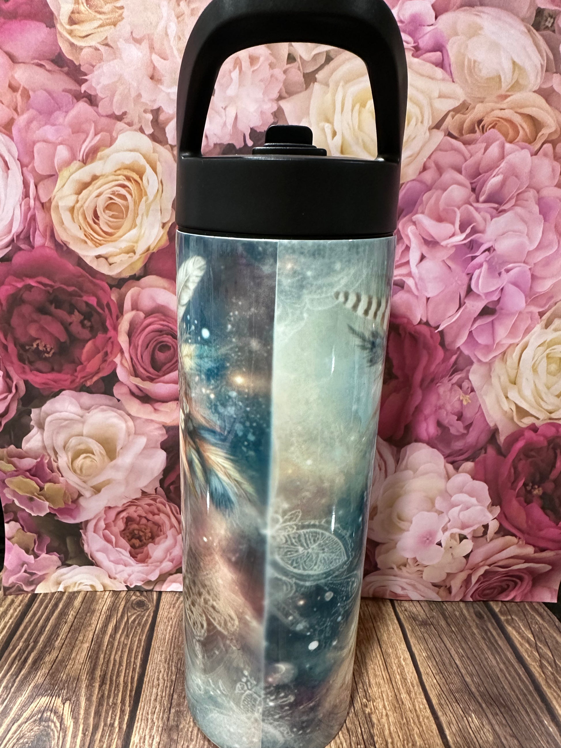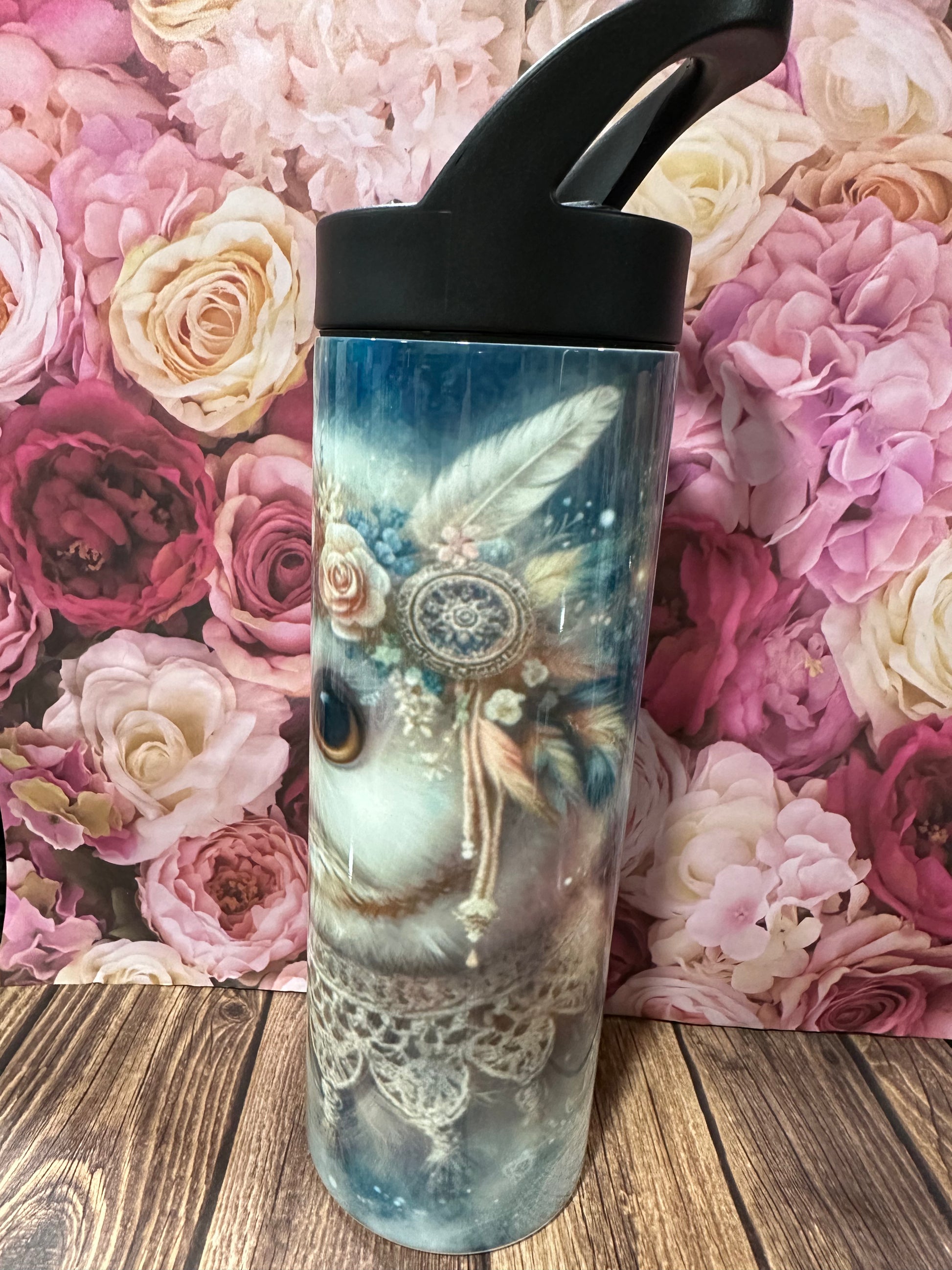 Owl themed sublimated images on a 20 oz stainless steel double walled tumbler. It has a flip straw.