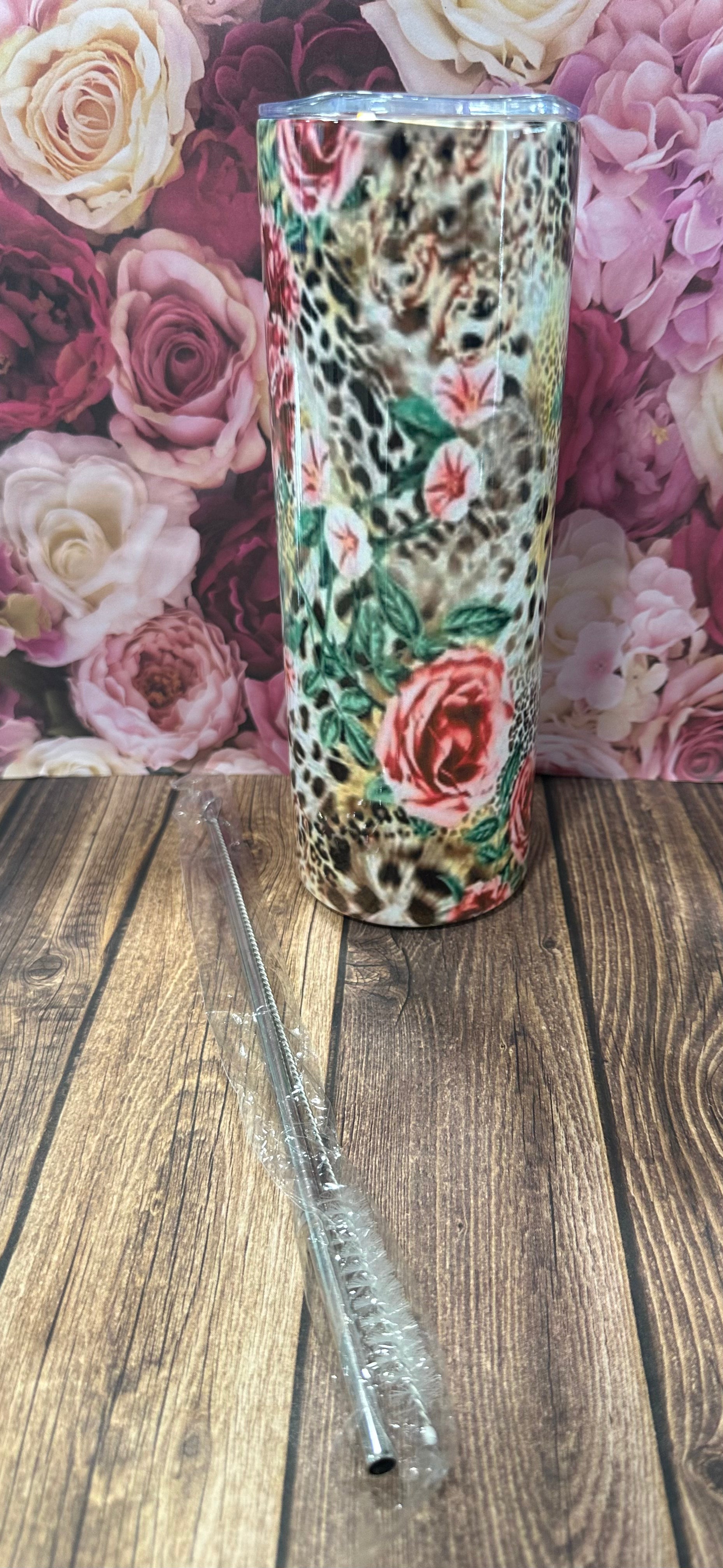 Flower and cheetah themed sublimated images on a 20 oz stainless steel double walled tumbler. It comes with a metal straw and a brush.
