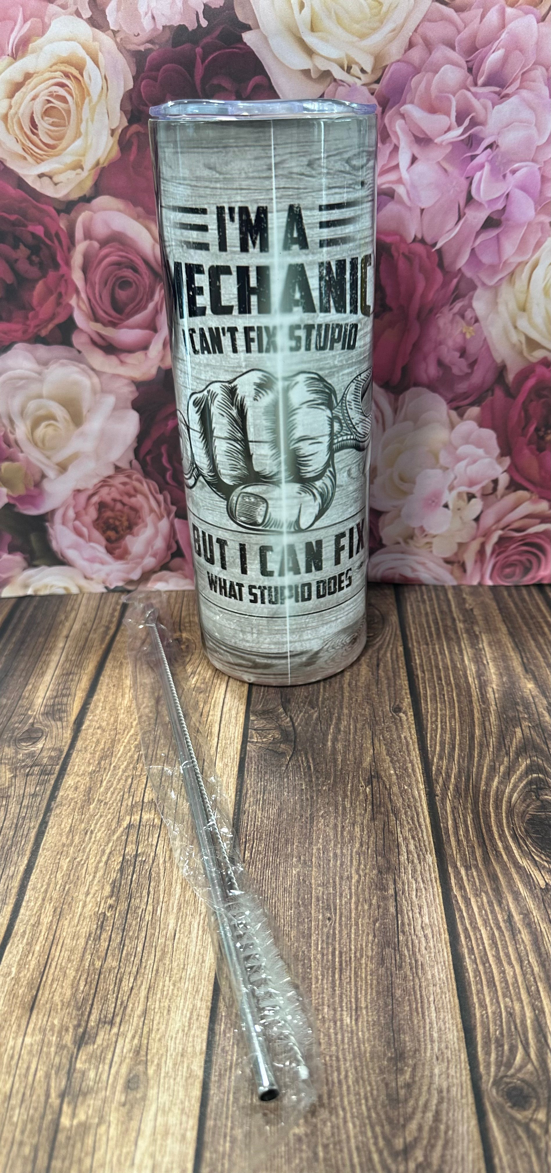 mechanic themed sublimated images on a 20 oz stainless steel double walled tumbler. It comes with a metal straw and a brush.
