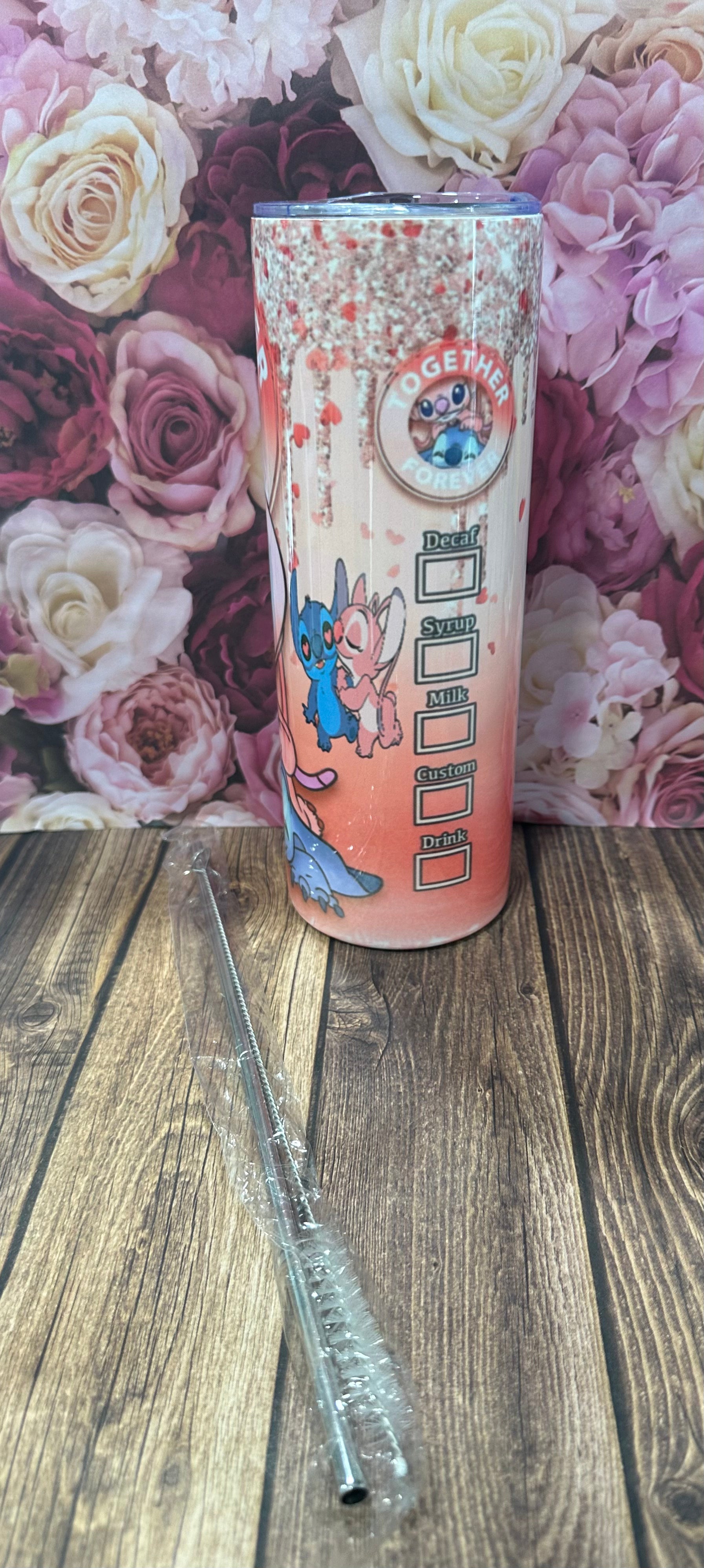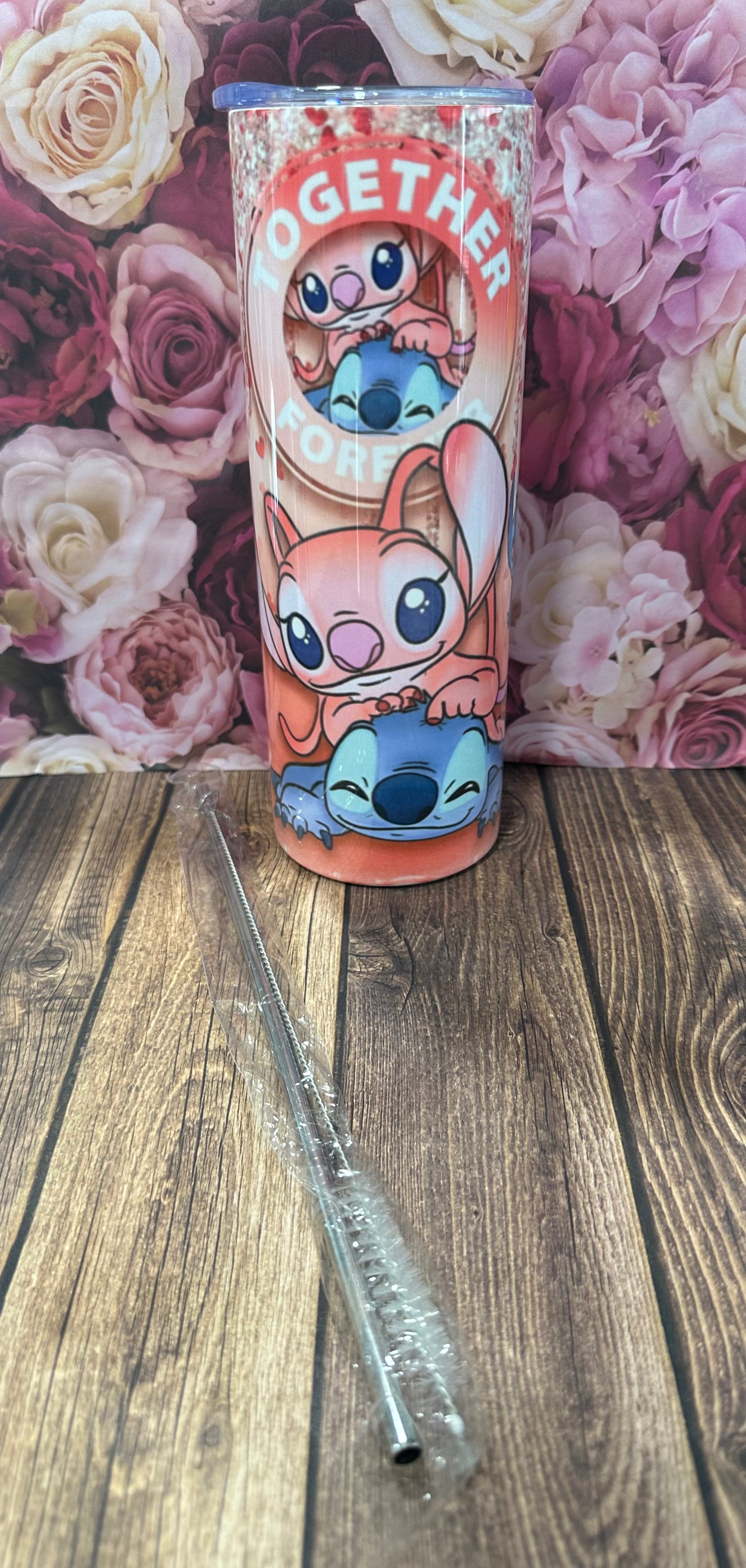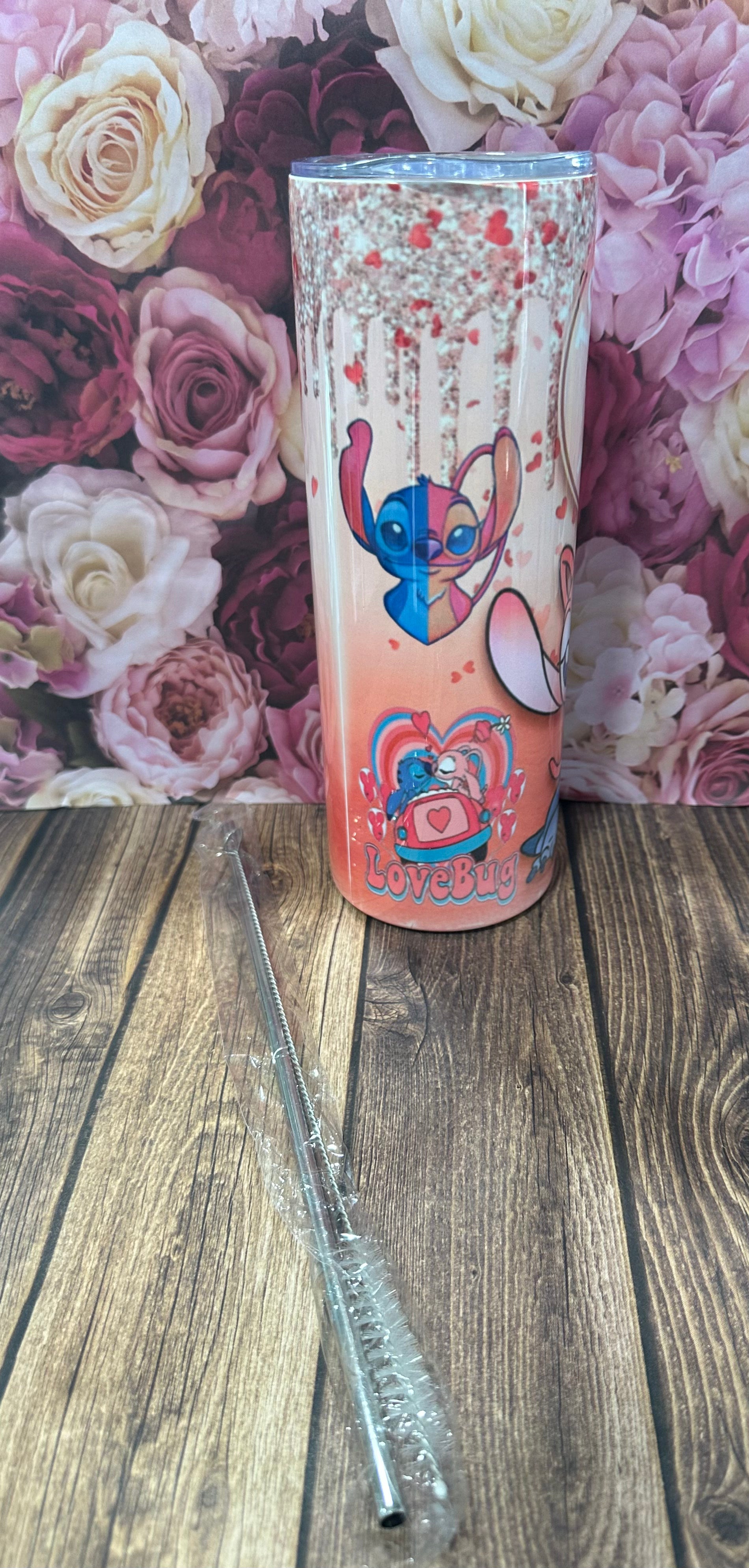 Stitch themed sublimated images on a 20 oz stainless steel double walled tumbler. It comes with a metal straw and a brush.