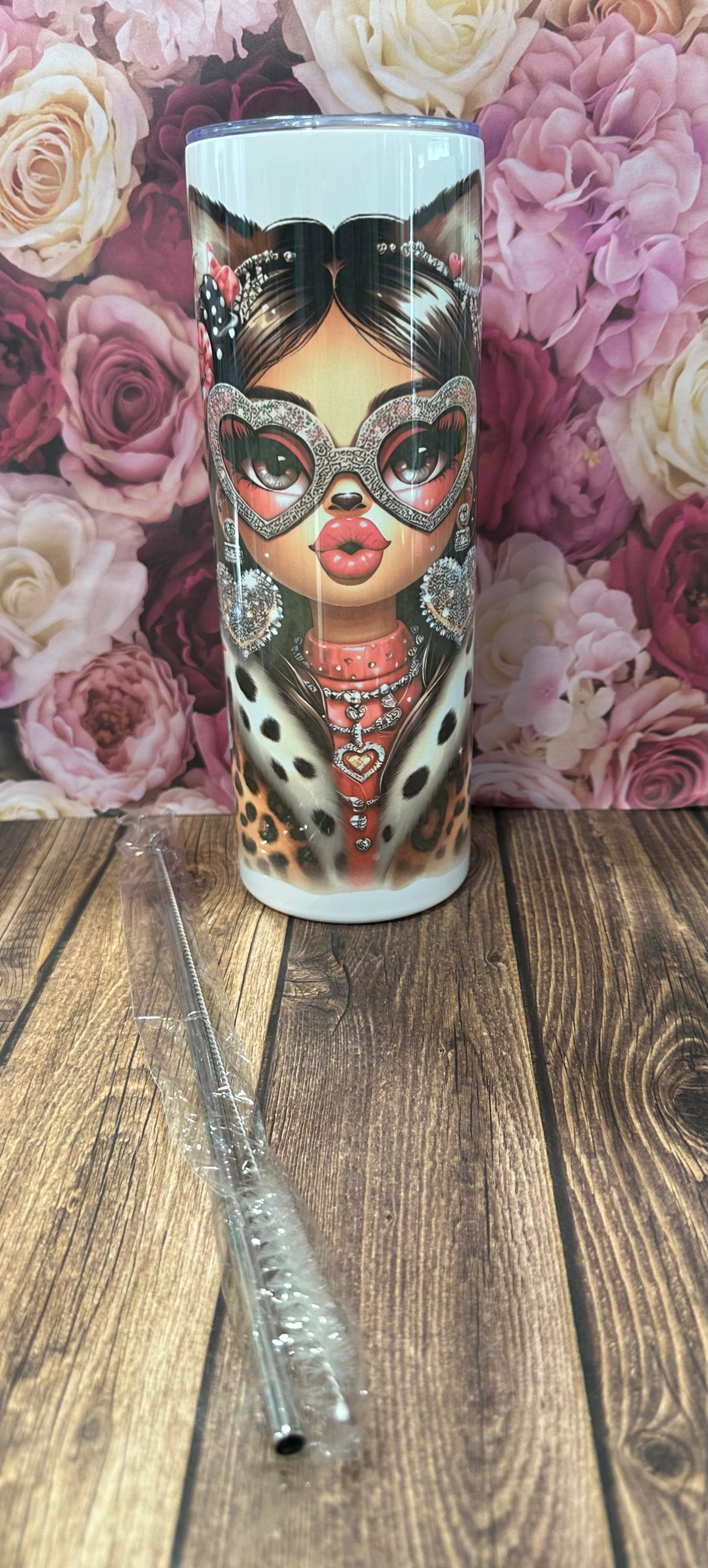 Girl with coffee themed sublimated images on a 20 oz stainless steel double walled tumbler. It comes with a metal straw and a brush.