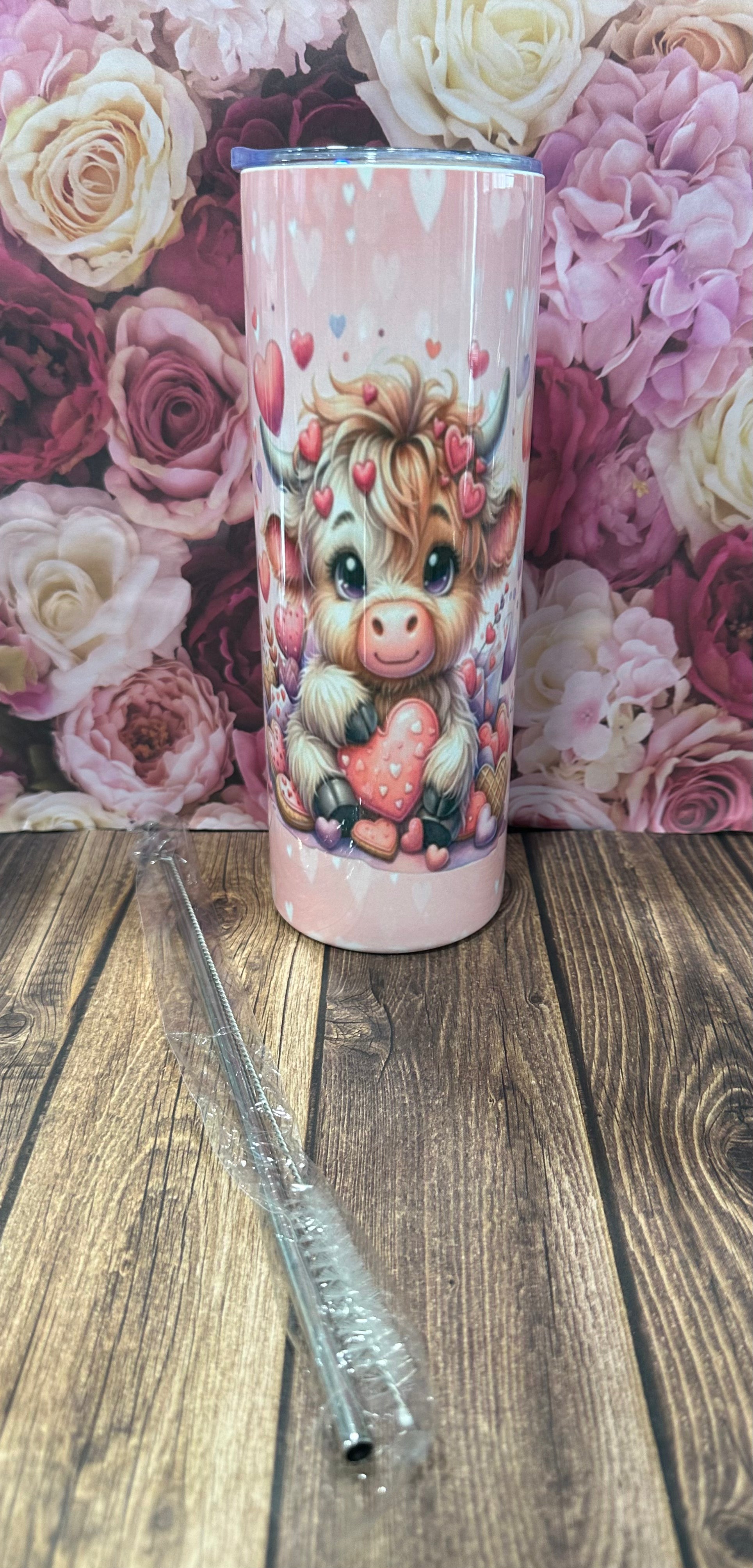 Cow themed sublimated images on a 20 oz stainless steel double walled tumbler. It comes with a metal straw and a brush.