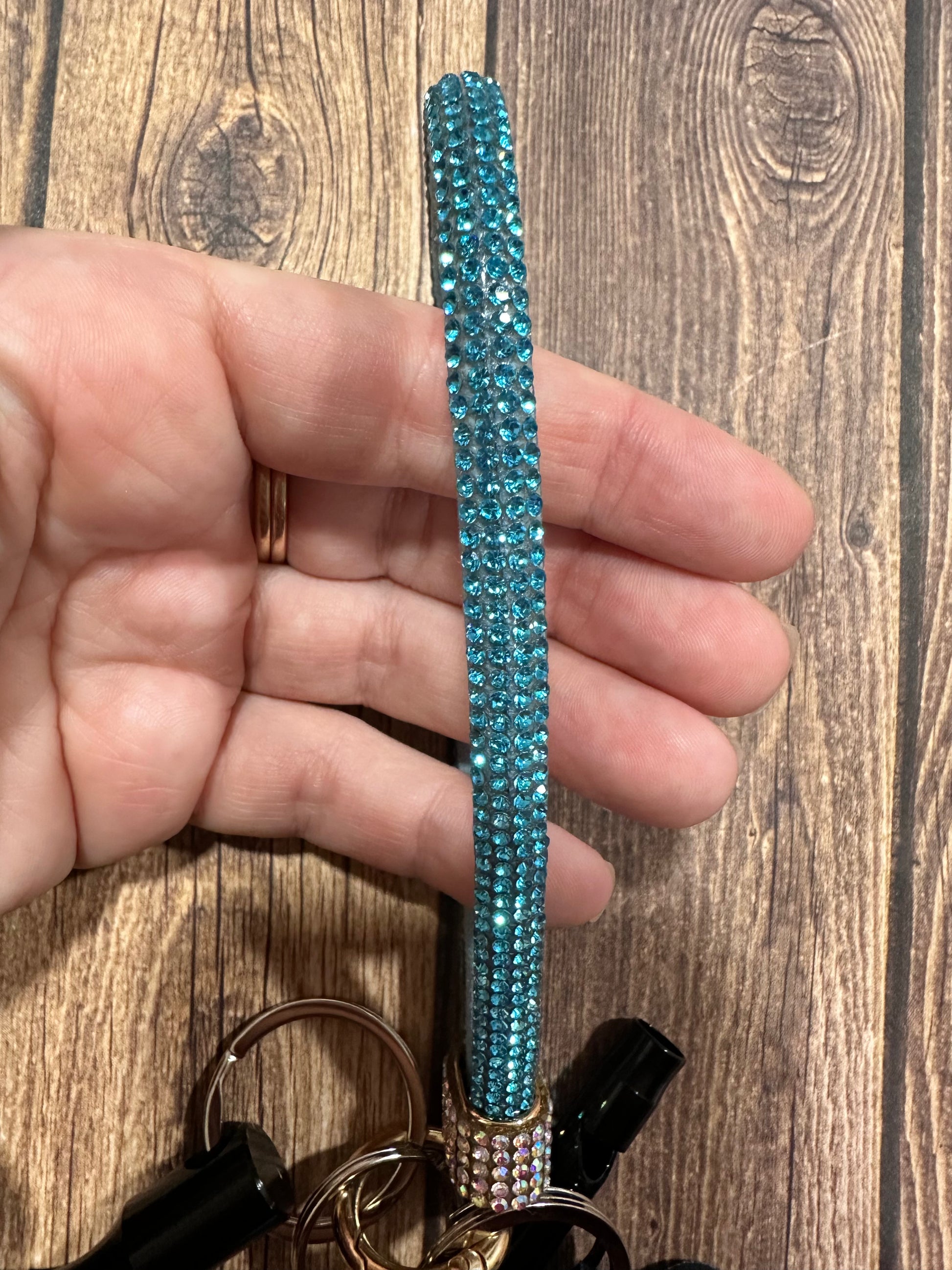 This wristlet safety keychain has the following items. Wristlet, kubaton, whistle, alarm, and chapstick holder.