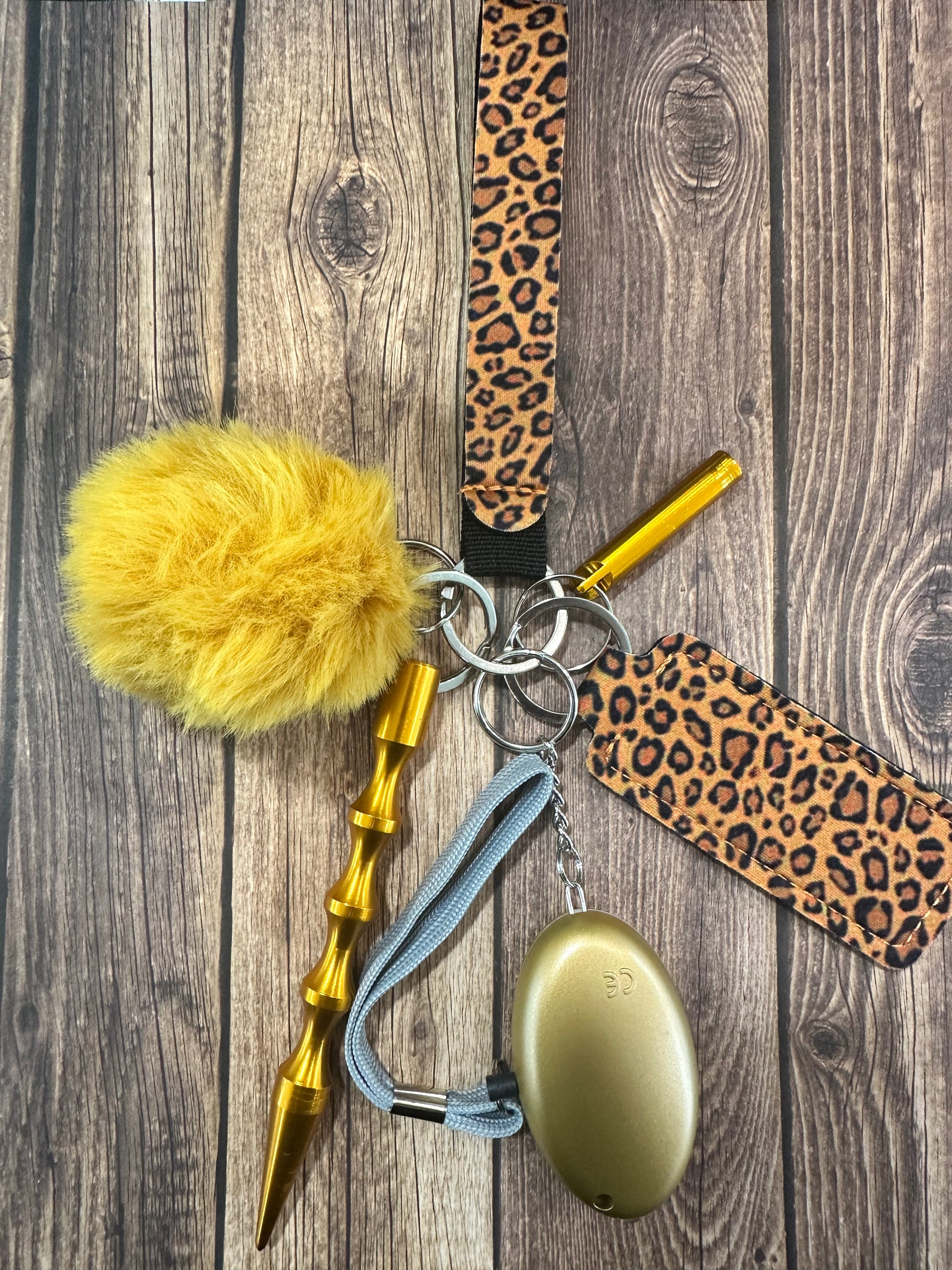 This wristlet safety keychain has the following items. Wristlet, kubaton,  whistle, alarm, chapstick holder and pom pom.
