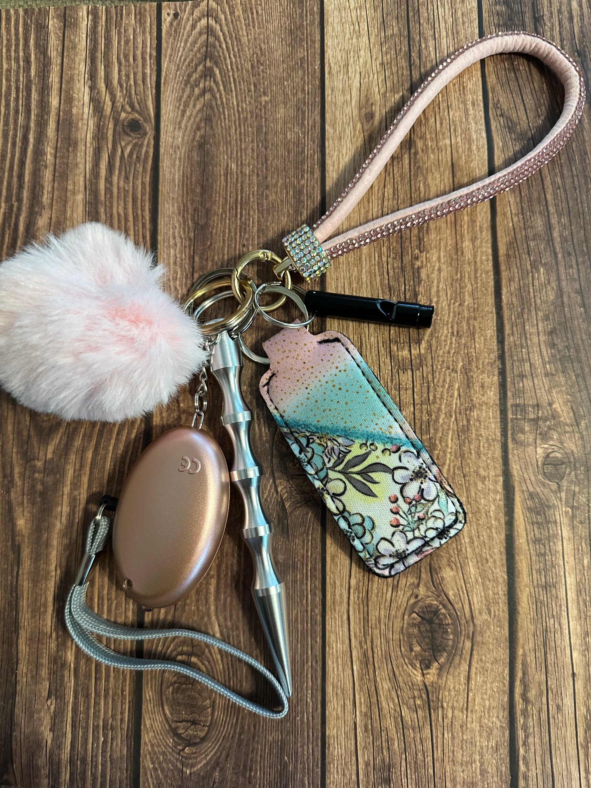 This wristlet safety keychain has the following items. kubaton, whistle, alarm, chapstick holder and pom pom.