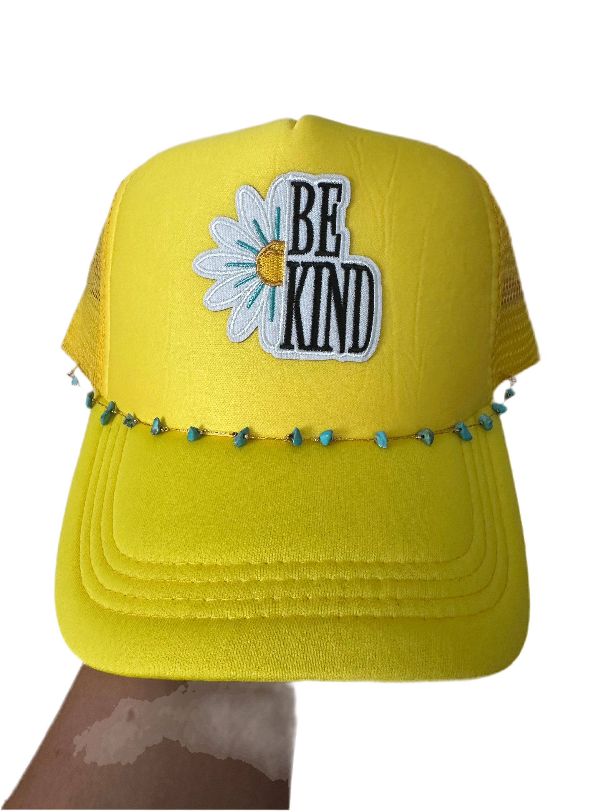 Yellow hat with a white, teal and black patch. It has teak beads.