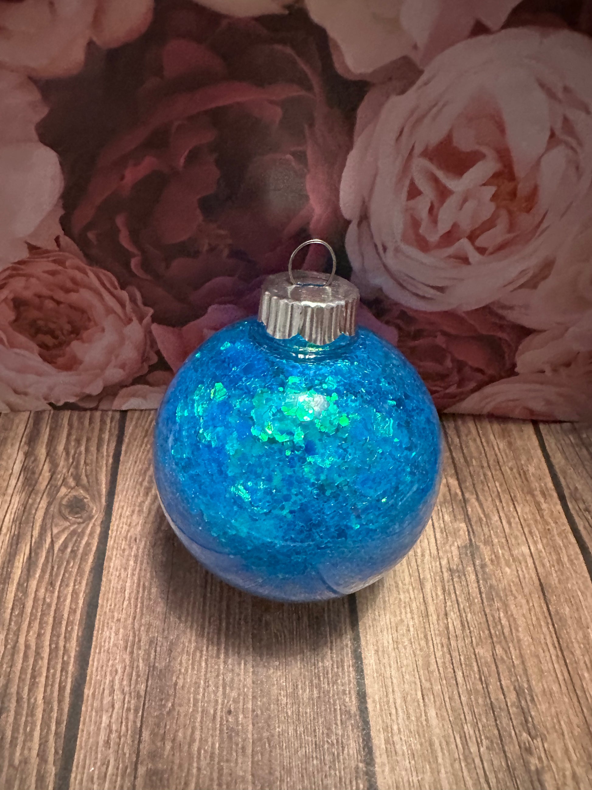 Blue multi glitter in a plastic 67 mm christmas ornament.