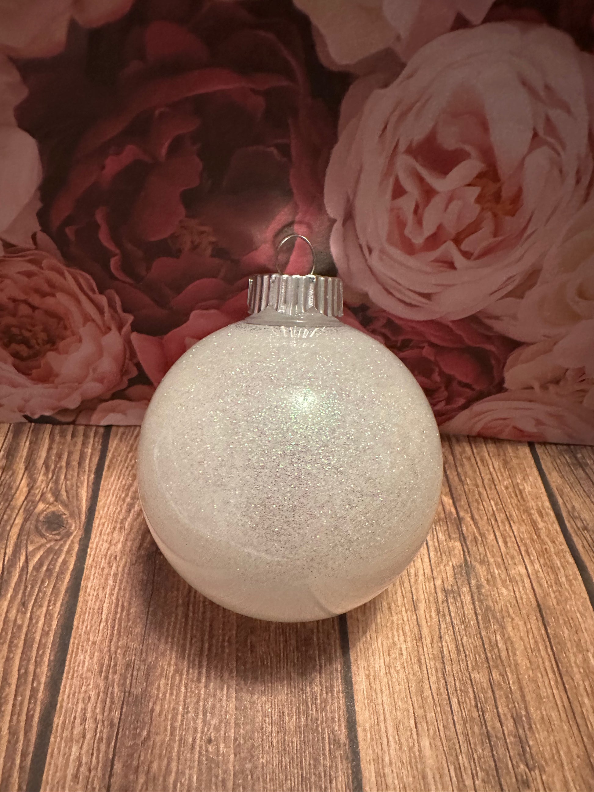 White glitter in a plastic 67 mm christmas ornament.