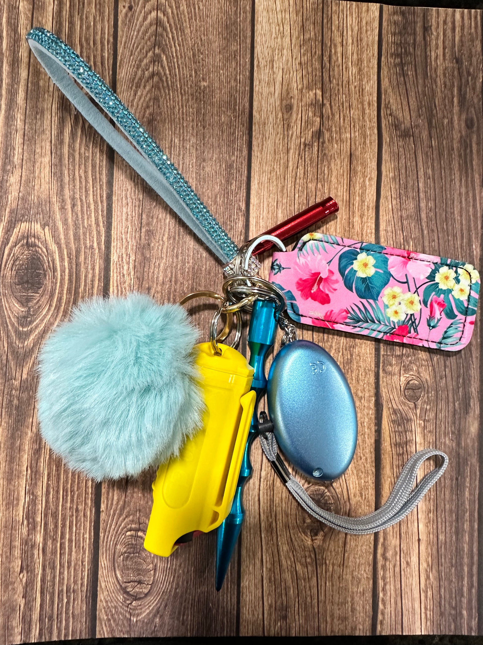 This wristlet safety keychain has the following items. Wristlet, kubaton, whistle, alarm, chapstick holder, pepper spray and a pom pom.