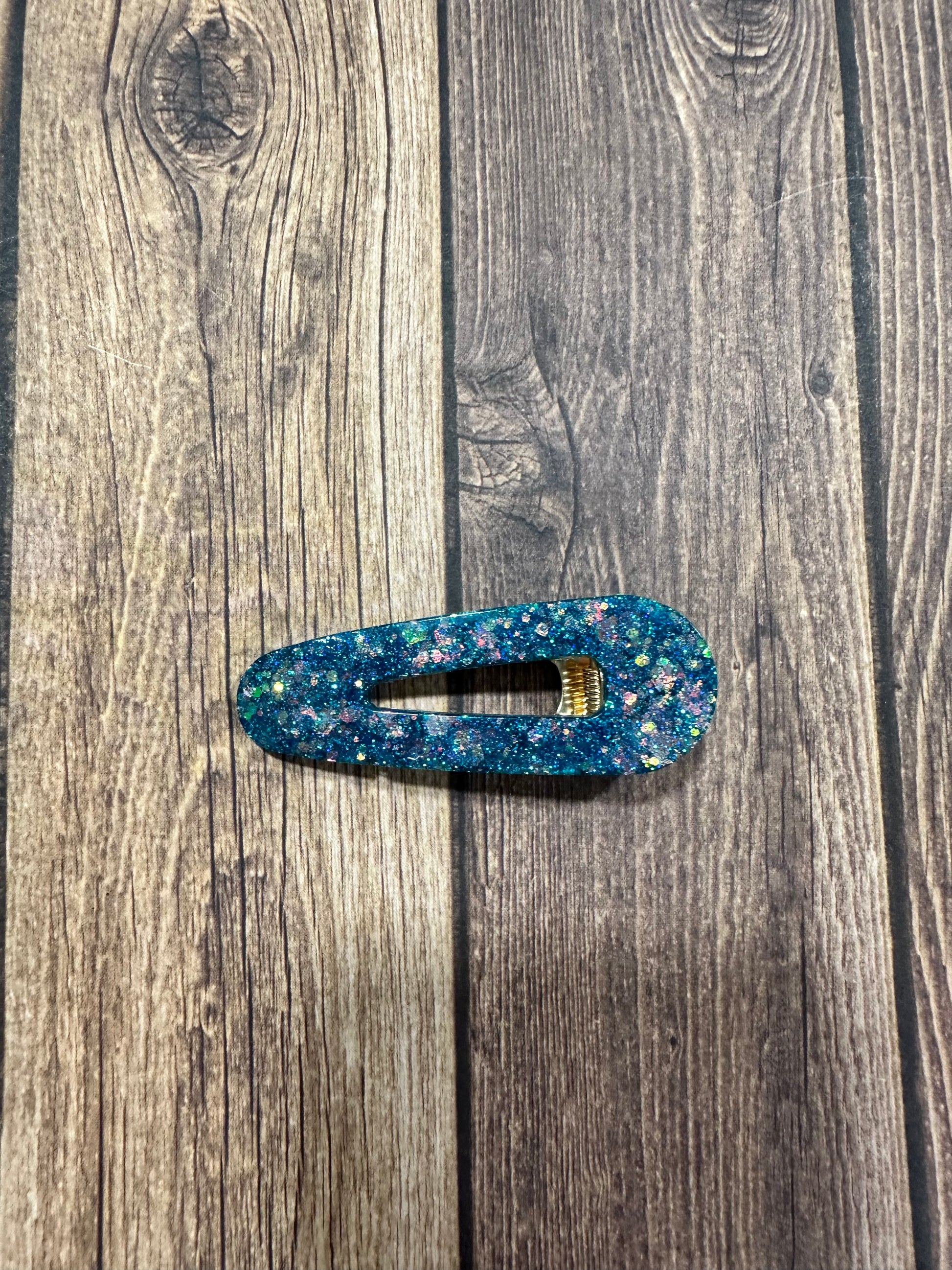 Blue glitter water drop hair clip. The actual clip is gold. Made with resin.